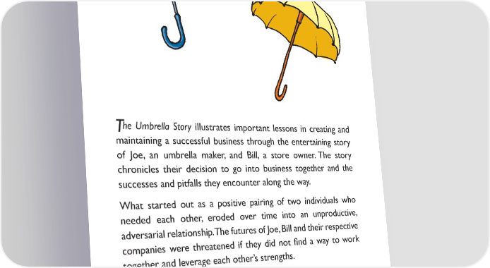 he Umbrella Story illustrates important lessons in creating and T maintaining a successful business through the entertaining story of Joe, an umbrella maker, and Bill, a store owner. The story chronicles their decision to go into business together and the successes and pitfalls they encounter along the way. What started out as a positive pairing of two individuals who needed each other, eroded over time into an unproductive, adversarial relationship. The futures of Joe, Bill and their respective companies were threatened if they did not 昀椀nd a way to work together and leverage each other’s strengths. The simple story told in these pages echoes what large corporations and those who represent them (dealers, distributors or reps) face every day in their business relationships. If they don’t act upon the lessons learned in this story, they’ll succumb to the forces threatening them — their competition, their technology and their greatest threat — each other. 3