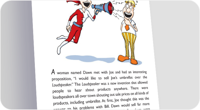 A woman named Dawn met with Joe and had an interesting proposition, “I would like to sell Joe’s umbrellas over the Loudspeaker.” The Loudspeaker was a new invention that allowed people to hear about products anywhere. There were loudspeakers all over town shouting out sale prices on all kinds of products, including umbrellas. At 昀椀rst, Joe thought this was the answer to his problems with Bill. Dawn would sell far more umbrellas than Bill’s Outerwear ever could. But, there were problems. Dawn would also sell his competitors’ umbrellas and Dawn wanted a huge commission — in fact, so much commission that Joe would have to change the way he made umbrellas to break even, let alone make a little money. This scared Joe even more than his problems with Bill. 10