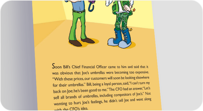 Soon Bill’s Chief Financial Of昀椀cer came to him and said that it was obvious that Joe’s umbrellas were becoming too expensive. “With these prices, our customers will soon be looking elsewhere for their umbrellas.” Bill, being a loyal person, said, “I can’t turn my back on Joe; he’s been good to me.” The CFO had an answer, “Let’s sell all brands of umbrellas, including competitors of Joe’s.” Not wanting to hurt Joe’s feelings, he didn’t tell Joe and went along with the CFO’s idea. As time went on, the people that Joe and Bill chose to handle their relationship were reassigned, 昀椀red or had quit. Joe and Bill hardly ever saw each other, but they did have a relationship — a strained one. Joe was convinced that Bill was disloyal because he sold any umbrella the customer asked for — even ones that Joe didn’t make. 8
