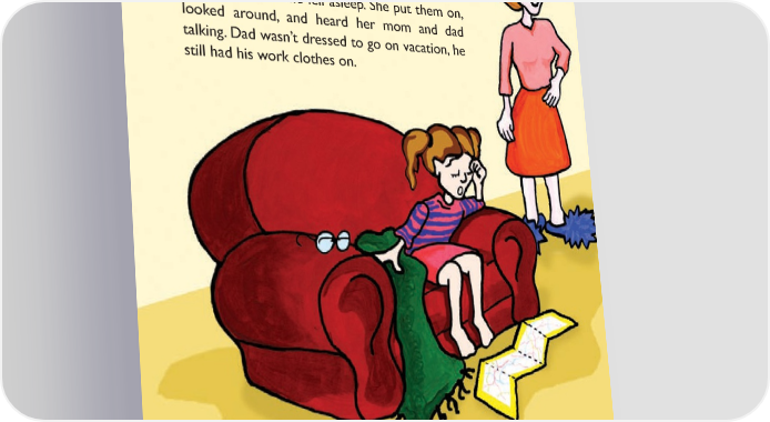 She took off her glasses, closed her eyes for a moment and then opened them. It was morning. She was on the couch. She must have fallen asleep with Dad watching TV. She got up, and the map fell to the 昀氀oor, she had been clasping it all night. There were her real glasses, she must have taken them off before she fell asleep. She put them on, looked around, and heard her mom and dad talking. Dad wasn’t dressed to go on vacation, he still had his work clothes on. 20 20