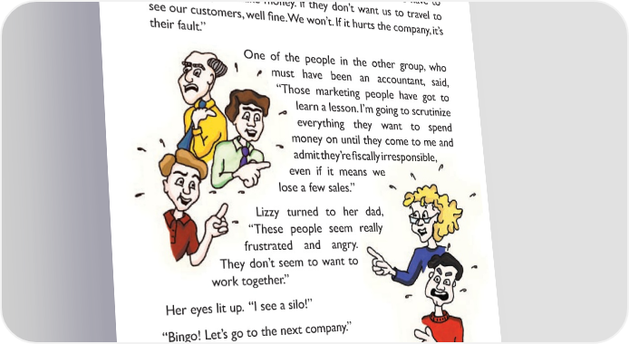 “Lizzy, listen closely.” Dad and Lizzy watched a group of people. They seemed very angry. They were pointing and gesturing toward another group of people who were doing the same. She listened. One of the people said, “Accounting doesn’t get it. We have to spend money to make money. If they don’t want us to travel to see our customers, well 昀椀ne. We won’t. If it hurts the company, it’s their fault.” One of the people in the other group, who must have been an accountant, said, “Those marketing people have got to learn a lesson. I’m going to scrutinize everything they want to spend money on until they come to me and admit they’re 昀椀scally irresponsible, even if it means we lose a few sales.” Lizzy turned to her dad, “These people seem really frustrated and angry. They don’t seem to want to work together.” Her eyes lit up. “I see a silo!” “Bingo! Let’s go to the next company.” The next building was huge. The sign out front said, World’s Best Widgies. It was 昀椀lled with people — mostly slow-moving people. “Dad, this company has people that look like they’re moving in slow motion.” 12