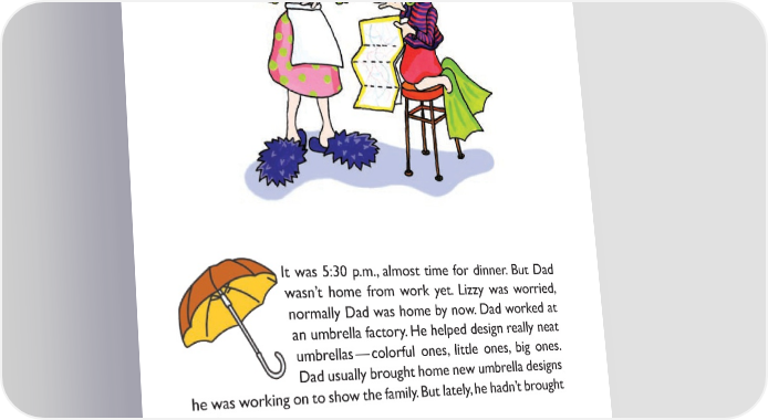 It was 5:30 p.m., almost time for dinner. But Dad wasn’t home from work yet. Lizzy was worried, normally Dad was home by now. Dad worked at an umbrella factory. He helped design really neat umbrellas — colorful ones, little ones, big ones. Dad usually brought home new umbrella designs he was working on to show the family. But lately, he hadn’t brought any home. “Mom, where’s Dad? Doesn’t he remember we’re going on vacation tomorrow? We’ve got to pack and get the map out and 昀椀gure out how we’re going to get to Grandma’s new house.” That’s what eight-year-old Lizzy loved the most, not going on vacation, but sitting with Dad and mapping out how to get to far away places they’ve never been to. 3