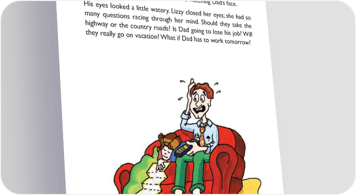 But before she could reply, there was a news story on the business program. The man who ran Dad’s company was on TV answering questions. Dad turned up the volume. All he could hear him say was, “We’re considering all options, but of course we’d like to avoid a plant closing or a lay-off if at all possible.” Lizzy stopped watching TV and started watching Dad’s face. His eyes looked a little watery. Lizzy closed her eyes; she had so many questions racing through her mind. Should they take the highway or the country roads? Is Dad going to lose his job? Will they really go on vacation? What if Dad has to work tomorrow? 8