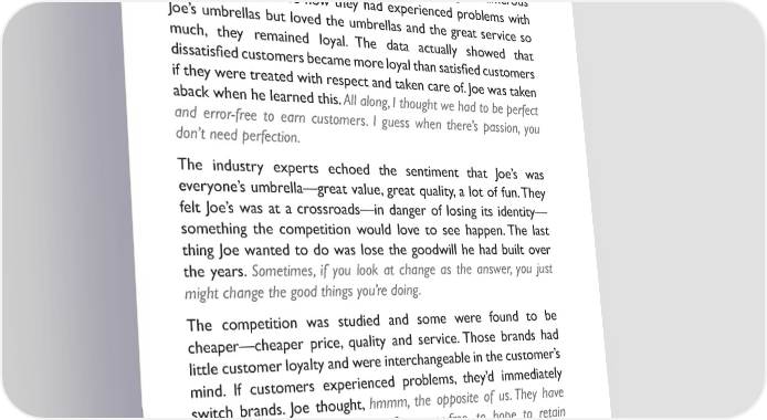 Customers shared countless experiences, but over and over, they shared their passion toward the product and the people of Joe’s Umbrellas. They felt Joe’s was the best value, very clever, very fun to own—BUT they felt that Joe’s was not the cheapest nor should it be. They also expressed concern at Joe’s attempt at producing an upscale umbrella—they felt it wasn’t Joe’s strength. Numerous customers recounted how they had experienced problems with Joe’s umbrellas but loved the umbrellas and the great service so much, they remained loyal. The data actually showed that dissatis昀椀ed customers became more loyal than satis昀椀ed customers if they were treated with respect and taken care of. Joe was taken aback when he learned this. All along, I thought we had to be perfect and error-free to earn customers. I guess when there’s passion, you don’t need perfection. The industry experts echoed the sentiment that Joe’s was everyone’s umbrella—great value, great quality, a lot of fun. They felt Joe’s was at a crossroads—in danger of losing its identity— something the competition would love to see happen. The last thing Joe wanted to do was lose the goodwill he had built over the years. Sometimes, if you look at change as the answer, you just might change the good things you’re doing. The competition was studied and some were found to be cheaper—cheaper price, quality and service. Those brands had little customer loyalty and were interchangeable in the customer’s mind. If customers experienced problems, they’d immediately switch brands. Joe thought, hmmm, the opposite of us. They have no passion; they have to be perfect, error-free, to hope to retain a customer. Several competitive brands were extremely expensive; they had carved out their niche and were 昀椀rmly entrenched in the minds of their loyal customers. Those brands deservedly had earned their customer base; Joe’s would be hard-pressed to make an 13