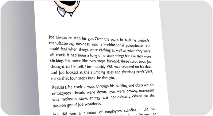 Joe always trusted his gut. Over the years, he built his umbrella manufacturing business into a multinational powerhouse. He could feel when things were clicking as well as when they were off track. It had been a long time since things felt like they were clicking. It’s more like two steps forward, three steps back, Joe thought to himself. The monthly P&L was dropped on his desk, and Joe looked at the slumping sales and shrinking pro昀椀t. Well, make that four steps back, he thought. Restless, he took a walk through his building and observed his employees—heads were down, eyes were drowsy, movement was molasses slow, energy was non-existent. Where has the passion gone? Joe wondered. He did see a number of employees standing in the hall; they seemed animated. Ah, signs of life! As he listened, he heard mostly questions: “Why did they change the program? It was the best thing they had going.” “Why don’t you do like I do and keep your head low?” “Why did they think the new product would ever sell?” “Why even try? Nothing matters anyway.” Joe strained to hear anything positive out of the group, but all he heard was: why, why, why? 3