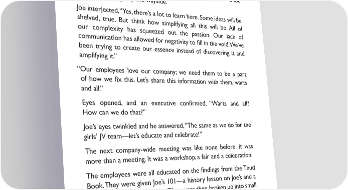 “Our marketing and promotions have been misguided.” “We’ve been trying to change our way out of this—if we don’t watch out, we’ll change the very things that have brought us success.” “This will dramatically affect our new product development—a lot of projects will go by the wayside.” Joe interjected, “Yes, there’s a lot to learn here. Some ideas will be shelved, true. But think how simplifying all this will be. All of our complexity has squeezed out the passion. Our lack of communication has allowed for negativity to 昀椀ll in the void. We’ve been trying to create our essence instead of discovering it and amplifying it.” “Our employees love our company; we need them to be a part of how we 昀椀x this. Let’s share this information with them, warts and all.” Eyes opened, and an executive con昀椀rmed, “Warts and all? How can we do that?” Joe’s eyes twinkled and he answered, “The same as we do for the girls’ JV team—let’s educate and celebrate!” The next company-wide meeting was like none before. It was more than a meeting. It was a workshop, a fair and a celebration. The employees were all educated on the 昀椀ndings from the Thud Book. They were given Joe’s 101—a history lesson on Joe’s and a snapshot of the competition. They were then broken up into small groups. There, they discussed the 昀椀ndings and applied them to make Joe’s a better place to work and a better company overall for dealers and customers alike. The ideas came on like an avalanche. 15