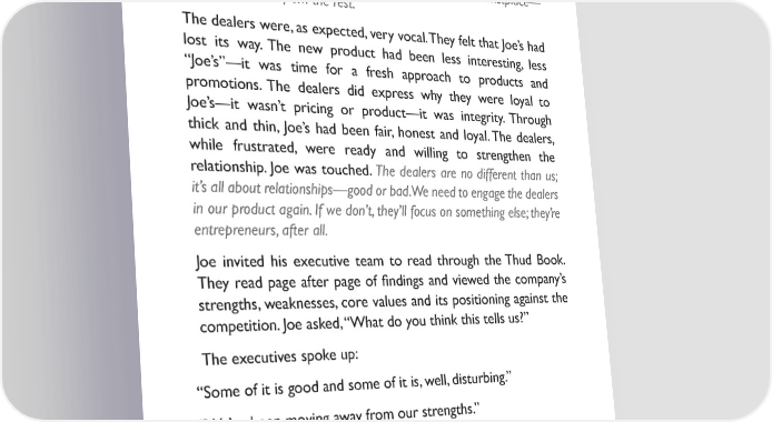 impact there without damaging its reputation. Another interesting 昀椀nding was that, over time, all of the competitors’ advertising had become very similar—they had all lost their identity, including Joe’s. Joe compared his advertising to his competitors. We all look alike. We’ve become “me-too.” But that’s an opportunity for us to re-introduce Joe’s Umbrellas to the marketplace— we can stand out from the rest. The dealers were, as expected, very vocal. They felt that Joe’s had lost its way. The new product had been less interesting, less “Joe’s”—it was time for a fresh approach to products and promotions. The dealers did express why they were loyal to Joe’s—it wasn’t pricing or product—it was integrity. Through thick and thin, Joe’s had been fair, honest and loyal. The dealers, while frustrated, were ready and willing to strengthen the relationship. Joe was touched. The dealers are no different than us; it’s all about relationships—good or bad. We need to engage the dealers in our product again. If we don’t, they’ll focus on something else; they’re entrepreneurs, after all. Joe invited his executive team to read through the Thud Book. They read page after page of 昀椀ndings and viewed the company’s strengths, weaknesses, core values and its positioning against the competition. Joe asked, “What do you think this tells us?” The executives spoke up: “Some of it is good and some of it is, well, disturbing.” “We’ve been moving away from our strengths.” “We’ve been trying to be all things to all people.” “Our dealers are loyal—they appreciate our relationship with them.” “Our departments don’t understand each other.” 14