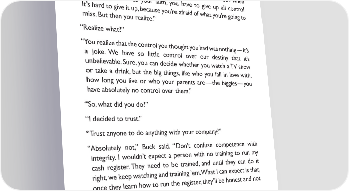 afraid of was already beginning to happen — I wasn’t making any money, I was miserable, the employees hated me — it was terrible.” “What did you do?” Bill asked. “Well, I don’t know if you’re a religious man — I am — but when you give yourself to your faith, you have to give up all control. It’s hard to give it up, because you’re afraid of what you’re going to miss. But then you realize.” “Realize what?” “You realize that the control you thought you had was nothing — it’s a joke. We have so little control over our destiny that it’s unbelievable. Sure, you can decide whether you watch a TV show or take a drink, but the big things, like who you fall in love with, how long you live or who your parents are — the biggies — you have absolutely no control over them.” “So, what did you do?” “I decided to trust.” “Trust anyone to do anything with your company?” “Absolutely not,” Buck said. “Don’t confuse competence with integrity. I wouldn’t expect a person with no training to run my cash register. They need to be trained, and until they can do it right, we keep watching and training ’em. What I can expect is that, once they learn how to run the register, they’ll be honest and not steal. Simple as that.” “So, you trust your employees with your money. You’re in a cash business — a few dollars could be stolen.” “Could be, but it doesn’t happen here. Linda and Ernie handle my money, put it in a cardboard box, wrap a rubber band around it 20