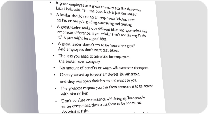 • Doing, or re-doing, someone else’s job robs him or her of learning, and failing or succeeding. It also takes away that person’s pride and passion. • A great employee at a great company acts like the owner. Like Linda said: “I’m the boss, Buck is just the owner.” • A leader should not do an employee’s job, but must do his or her job: guiding, counseling and trusting. • A great leader seeks out different ideas and approaches and embraces difference. If you think, “That’s not the way I’d do it,” it just might be a good idea. • A great leader doesn’t try to be “one of the guys.” And employees don’t want that either. • The less you need to advertise for employees, the better your company. • No amount of bene昀椀ts or wages will overcome disrespect. • Open yourself up to your employees. Be vulnerable, and they will open their hearts and minds to you. • The greatest respect you can show someone is to be honest with him or her. • Don’t confuse competence with integrity. Train people to be competent, then trust them to be honest and do what is right. • At the best companies, employees discipline themselves. They want to protect their environment. • Nobody is perfect; sometimes a person slips. Accept that. Obsessing on it and assuming everyone is dishonest will breed more dishonesty. 34
