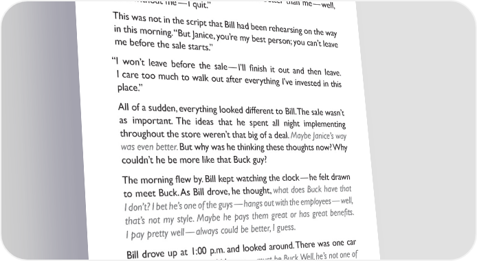 “Janice, what’s wrong?” “You did it again. You changed all my work — I have no purpose here, no value — you think you can do it better than me — well, do it without me — I quit.” This was not in the script that Bill had been rehearsing on the way in this morning. “But Janice, you’re my best person; you can’t leave me before the sale starts.” “I won’t leave before the sale — I’ll 昀椀nish it out and then leave. I care too much to walk out after everything I’ve invested in this place.” All of a sudden, everything looked different to Bill. The sale wasn’t as important. The ideas that he spent all night implementing throughout the store weren’t that big of a deal. Maybe Janice’s way was even better. But why was he thinking these thoughts now? Why couldn’t he be more like that Buck guy? The morning 昀氀ew by. Bill kept watching the clock — he felt drawn to meet Buck. As Bill drove, he thought, what does Buck have that I don’t? I bet he’s one of the guys — hangs out with the employees — well, that’s not my style. Maybe he pays them great or has great bene昀椀ts. I pay pretty well — always could be better, I guess. Bill drove up at 1:00 p.m. and looked around. There was one car in the lot — a 10-year-old Jaguar — must be Buck. Well, he’s not one of the guys — his employees drive pick-ups, if they drive at all, thought Bill. 12