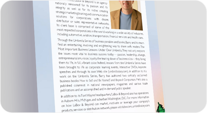 About the Authors A two-time Ernst & Young Entrepreneur of the Year and inductee into the Entrepreneur of the Year Hall of Fame, Barry LaBov is the founder and president of LaBov & Beyond Marketing Communications, Inc. Based in Fort Wayne, Indiana, LaBov & Beyond is an agency nationally renowned for its passion and its integrity as well as for its niche: creating strategic marketing, training and communication solutions for corporations with dealer, distributor or sales representative networks. Its client base is comprised of some of the most respected corporations in the world working in a wide variety of industries, including automotive, aviation, transportation, 昀椀nancial services and health care. Through the Umbrella Series of business parables and books, Barry and his team 昀椀nd an entertaining, involving and enlightening way to share with readers The Most Important Business Lessons Under One Umbrella. They not only explore the issues most vital to business success today — passion, leadership, change, entrepreneurialism, vision, loyalty, the tearing down of business silos — they bring them to life, in full, vibrant color. Indeed, lessons from the Umbrella Series have been brought to life as corporate learning events, interactive DVDs, keynote speeches and through its own Web site (umbrellastory.com). In addition to his work on the Umbrella Series, Barry has authored two critically acclaimed business books: How to Sell and Be Yourself and Beyond Comparison. He’s also a published columnist in national newspapers, magazines and various trade publications and an accomplished and in-demand public speaker. In addition to its Fort Wayne headquarters, LaBov & Beyond also has operations in Auburn Hills, Michigan, and suburban Washington, D.C. For more information on how LaBov & Beyond can market, motivate or leverage your company’s products, services or distribution network, please visit labov.com, umbrellastory.com, or call us at 260.497.0111. Cheryl Franks was the 昀椀rst of昀椀cial employee at LaBov & Beyond. Cheryl specializes in Instructional Design and creating strategic marketing, dynamic sales training and educational tools. Her 昀椀rsthand experience with sales professionals in various industries throughout the country is the inspiration behind The Boomerang and the Killer Stick and the boomerang selling concept.
