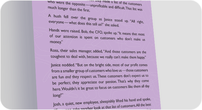 Bill and Janice immediately began focusing their energies on the most important issues. First, they turned to their employees and shared their concerns. Then, they spent a half-day analyzing their customer base. The employees made a list of the customers who were pro昀椀table and great to work with. Then they made a list of the customers who were the opposite — unpro昀椀table and dif昀椀cult. That list was much longer than the 昀椀rst. A hush fell over the group as Janice stood up. “All right, everyone — what does this tell us?” she asked. Hands were raised. Bob, the CFO, spoke up. “It means that most of our attention is spent on customers who don’t make us money.” Ross, their sales manager, added, “And those customers are the toughest to deal with, because we really can’t make them happy.” Janice nodded. “But on the bright side, most of our pro昀椀t comes from a smaller group of customers who love us — those customers are fun and they respect us. These customers don’t expect us to be perfect; they appreciate our passion. That’s why they come here. Wouldn’t it be great to focus on customers like them all day long?” Josh, a quiet, new employee, sheepishly lifted his hand and spoke, “Everyone, take another look at that list of customers. All the best customers have something in common — they have passion. They’re outdoorsy types — they love to 昀椀sh, they love to be out in nature. Our store 昀椀ts them — they share our passion and they feel at home here. The other group is different: all they want to hunt for are…bargains.” 20