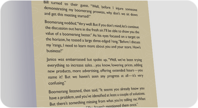 Bill turned to their guest. “Well, before I injure someone demonstrating my boomerang prowess, why don’t we sit down and get this meeting started?” Boomerang nodded, “Very well. But if you don’t mind, let’s continue the discussion out here in the fresh air. I’ll be able to show you the value of a boomerang better.” As his eyes focused on a target on the horizon, he tossed a large three-edged ’rang, “Before I discuss my ’rangs, I need to learn more about you and your store. How’s business?” Janice was embarrassed but spoke up, “Well, we’ve been trying everything to increase sales…you know, lowering prices, adding new products, more advertising, offering extended hours — you name it! But we haven’t seen any progress at all — it’s very confusing.” Boomerang listened, then said, “It seems you already know you have a problem, and you’ve identi昀椀ed at least a couple of solutions. But there’s something missing from what you’re telling me. What about your customers? You haven’t mentioned them once.” Janice piped up, “Sure we have. We’re lowering prices and advertising aggressively to bring in as many customers as possible.” “Right, you mentioned that,” their guest continued, “but what about your customers — your loyal customers?” 13