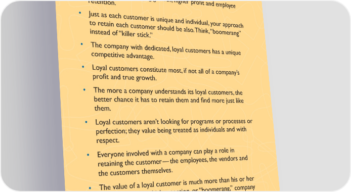 The Boomerang and the Killer Stick Lessons • At the heart of earning customer loyalty is more than a process or a program — it’s passion. • High customer retention is positively felt throughout an organization — bringing growth, higher pro昀椀t and employee retention. • Just as each customer is unique and individual, your approach to retain each customer should be also. Think, “boomerang” instead of “killer stick.” • The company with dedicated, loyal customers has a unique competitive advantage. • Loyal customers constitute most, if not all of a company’s pro昀椀t and true growth. • The more a company understands its loyal customers, the better chance it has to retain them and 昀椀nd more just like them. • Loyal customers aren’t looking for programs or processes or perfection; they value being treated as individuals and with respect. • Everyone involved with a company can play a role in retaining the customer — the employees, the vendors and the customers themselves. • The value of a loyal customer is much more than his or her last purchase. The high-retention, or “boomerang,” company calculates the real value and treats loyal customers accordingly. • The successful customer-loyalty approach is embraced, enacted and rewarded company-wide. 27