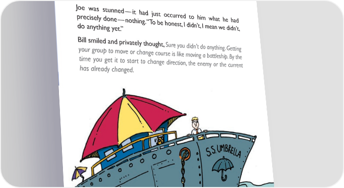 bill hung up the phone. “sorry, i had to make a course correction with my sales department,” he said. Joe was intrigued. “it sounds like you’re going through the same thing i did today. my sales VP told me of some sales issues that were pretty disturbing.” “so, what did you do?” Joe was stunned — it had just occurred to him what he had precisely done — nothing. “To be honest, i didn’t, i mean we didn’t, do anything yet.” bill smiled and privately thought, Sure you didn’t do anything. Getting your group to move or change course is like moving a battleship. By the time you get it to start to change direction, the enemy or the current has already changed. 9