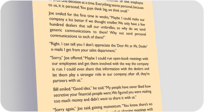 Joe interrupted, “Formality. we built our company around formality, organization, structure — we’ve just forgotten that those things are there to support us, not lead us.” “yeah, you big guys are great at mass — mass communications, systems, infrastructure and processes. us little guys are all about intimacy — making a difference one customer or one employee or even one decision at a time. everything seems personal, because to us, it is personal. you guys think big, we think small.” Joe smiled for the 昀椀rst time in weeks, “maybe i could make our company a lot better if we thought smaller. we only have a few hundred dealers that sell our umbrellas, so why do we send generic communications to them? why not send personal communications to each of them?” “right. i can tell you i don’t appreciate the ‘Dear Mr. or Ms. Dealer’ e-mails i get from your sales department.” “sorry,” Joe offered. “maybe i could run open-book meetings with our employees and get them involved with the way the company is run. i could even share that information with the dealers and let them play a stronger role in our company; after all, they’re partners with us.” bill smiled. “good idea,” he said. “my people have never liked how secretive your 昀椀nancial people were. we 昀椀gured you were making too much money and didn’t want to share it with us.” “sorry again,” Joe said, gaining momentum. “you know, there’s no reason why i can’t hold informal product planning meetings with customers, dealers and employees. why does only our product department decide what the best product is? in fact, they can be part of those meetings — they’d be fun, too.” “Joe, you’re getting the hang of this. i know we would’ve loved to have a voice in your product design. we’ve suggested 18