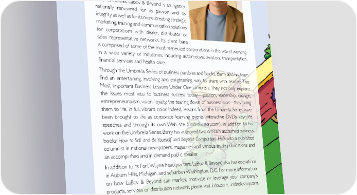 About the Author A two-time Ernst & Young Entrepreneur of the Year and inductee into the Entrepreneur of the Year Hall of Fame, Barry LaBov is the founder and president of LaBov & Beyond Marketing Communications, Inc. Based in Fort Wayne, Indiana, LaBov & Beyond is an agency nationally renowned for its passion and its integrity as well as for its niche: creating strategic marketing, training and communication solutions for corporations with dealer, distributor or sales representative networks. Its client base is comprised of some of the most respected corporations in the world working in a wide variety of industries, including automotive, aviation, transportation, 昀椀nancial services and health care. Through the Umbrella Series of business parables and books, Barry and his team 昀椀nd an entertaining, involving and enlightening way to share with readers The Most Important Business Lessons Under One Umbrella. They not only explore the issues most vital to business success today—passion, leadership, change, entrepreneurialism, vision, loyalty, the tearing down of business silos—they bring them to life, in full, vibrant color. Indeed, lessons from the Umbrella Series have been brought to life as corporate learning events, interactive DVDs, keynote speeches and through its own Web site (umbrellastory.com). In addition to his work on the Umbrella Series, Barry has authored two critically acclaimed business books: How to Sell and Be Yourself and Beyond Comparison. He’s also a published columnist in national newspapers, magazines and various trade publications and an accomplished and in-demand public speaker. In addition to its Fort Wayne headquarters, LaBov & Beyond also has operations in Auburn Hills, Michigan, and suburban Washington, D.C. For more information on how LaBov & Beyond can market, motivate or leverage your company’s products, services or distribution network, please visit labov.com, umbrellastory.com, or call us at 260.497.0111.