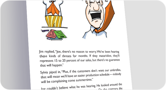 Jim replied, “Joe, there’s no reason to worry. we’ve been hearing these kinds of threats for months. if they materialize, they’ll represent 15 to 20 percent of our sales, but there’s no guarantee that will happen.” sylvia piped in, “Plus, if the customers don’t want our umbrellas, that will mean we’ll have an easier production schedule — nobody will be complaining come summertime.” Joe couldn’t believe what he was hearing. He looked around the room. Nobody seemed worried or upset. On the contrary, the mood was light, almost comatose. Joe felt as if his entire nervous system was beginning to overload. “what you’re saying is, we’re going to lose some business, and if we do, it’s no big deal, because it’ll mean less stress, less workload. if that was our goal when this business was started, we never would have met each other — we would have been out of business years ago.” 5