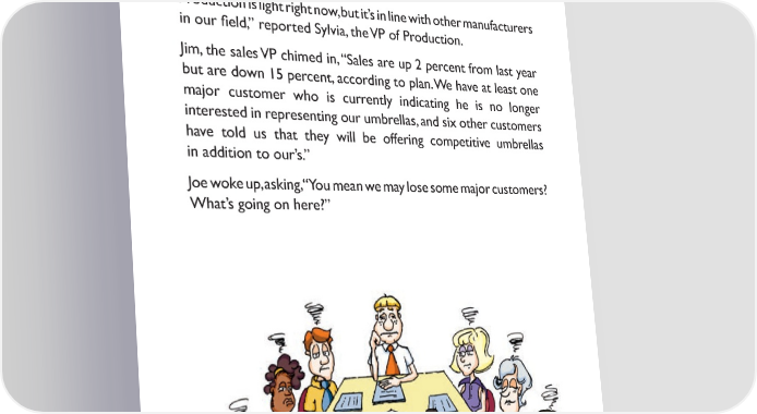...into the boardroom. a dozen high-level executives found their customary favorite seat and waited for the meeting to begin. Joe, the President, walked in and said, “let’s go.” For the next 90 minutes, Joe looked around the room, daydreamed, listened on and off to the weekly reports from each individual. It’s the same old same old, thought Joe. “Production is light right now, but it’s in line with other manufacturers in our 昀椀eld,” reported sylvia, the VP of Production. Jim, the sales VP chimed in, “sales are up 2 percent from last year but are down 15 percent, according to plan. we have at least one major customer who is currently indicating he is no longer interested in representing our umbrellas, and six other customers have told us that they will be offering competitive umbrellas in addition to our’s.” Joe woke up, asking, “you mean we may lose some major customers? what’s going on here?” 4