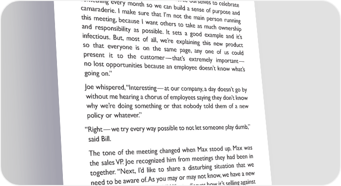 Joe showed up at 8:00 a.m. and walked in on a celebration. bill’s people were talking about a success they had with a new product. They meticulously explained the product, why their customers loved it and how they presented it to the customer. Joe turned to bill and said, “This is neat — why are you doing this?” “a bunch of reasons — 昀椀rst of all, we force ourselves to celebrate something every month so we can build a sense of purpose and camaraderie. i make sure that i’m not the main person running this meeting, because i want others to take as much ownership and responsibility as possible. it sets a good example and it’s infectious. but, most of all, we’re explaining this new product so that everyone is on the same page, any one of us could present it to the customer — that’s extremely important — no lost opportunities because an employee doesn’t know what’s going on.” Joe whispered, “interesting — at our company, a day doesn’t go by without me hearing a chorus of employees saying they don’t know why we’re doing something or that nobody told them of a new policy or whatever.” “right — we try every way possible to not let someone play dumb,” said bill. The tone of the meeting changed when max stood up. max was the sales VP. Joe recognized him from meetings they had been in together. “Next, i’d like to share a disturbing situation that we need to be aware of. as you may or may not know, we have a new competitor down the road. i’d like to discuss how it’s selling against us and how we can make sure that it doesn’t hurt our business.” max discussed in detail the competitor, its strengths and weaknesses, its recent success against bill’s store and how bill’s store could withstand the competition and ultimately win. The employees were somber but immersed. 12