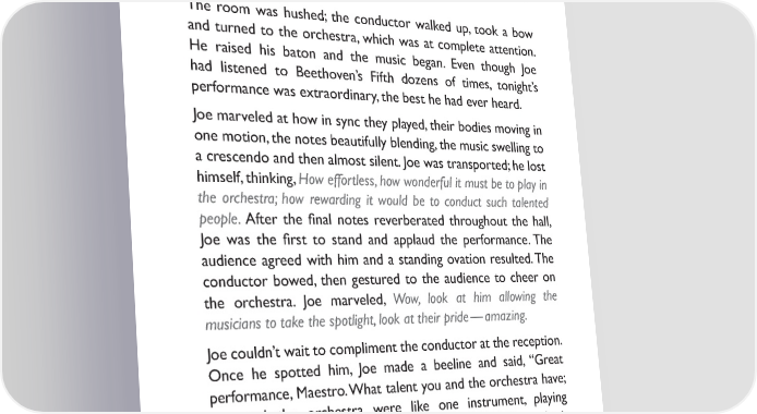 Joe was excited because they were performing his favorite, Beethoven’s Fifth. “DA, DA, DA, DAAAA,” Joe sang to himself. Joe arrived at the Arts Center and took his seat. The anticipation was overwhelming. He heard the instruments warming up. What dissonance. It’s amazing how beautiful it sounds when they play together, he thought. The room was hushed; the conductor walked up, took a bow and turned to the orchestra, which was at complete attention. He raised his baton and the music began. Even though Joe had listened to Beethoven’s Fifth dozens of times, tonight’s performance was extraordinary, the best he had ever heard. Joe marveled at how in sync they played, their bodies moving in one motion, the notes beautifully blending, the music swelling to a crescendo and then almost silent. Joe was transported; he lost himself, thinking, How effortless, how wonderful it must be to play in the orchestra; how rewarding it would be to conduct such talented people. After the 昀椀nal notes reverberated throughout the hall, Joe was the 昀椀rst to stand and applaud the performance. The audience agreed with him and a standing ovation resulted. The conductor bowed, then gestured to the audience to cheer on the orchestra. Joe marveled, Wow, look at him allowing the musicians to take the spotlight, look at their pride — amazing. Joe couldn’t wait to compliment the conductor at the reception. Once he spotted him, Joe made a beeline and said, “Great performance, Maestro. What talent you and the orchestra have; you and the orchestra were like one instrument, playing 昀氀awlessly. It must be incredible to be so talented. You make it look so effortless, so simple. I can tell you must have cracked the whip and worked the musicians hard — ” The Maestro interrupted, “Slow down, Joe. I appreciate your compliments, and I thank you for the enthusiasm. The orchestra 8
