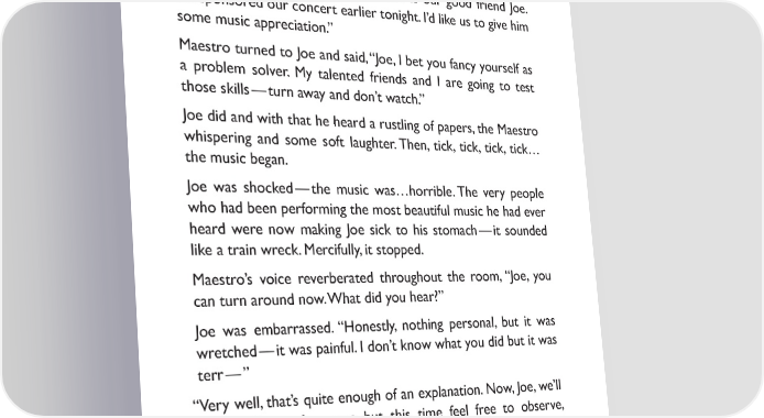 Maestro smiled and told Joe, “Well then, maybe you and your dealers are capable of playing beautiful music.” The Maestro looked at his watch. “Joe, I have to go to rehearsal, care to join me?” Joe and Maestro walked backstage to a rehearsal hall. The musicians were waiting. “Everyone, this is our good friend Joe. He sponsored our concert earlier tonight. I’d like us to give him some music appreciation.” Maestro turned to Joe and said, “Joe, I bet you fancy yourself as a problem solver. My talented friends and I are going to test those skills — turn away and don’t watch.” Joe did and with that he heard a rustling of papers, the Maestro whispering and some soft laughter. Then, tick, tick, tick, tick… the music began. Joe was shocked — the music was…horrible. The very people who had been performing the most beautiful music he had ever heard were now making Joe sick to his stomach — it sounded like a train wreck. Mercifully, it stopped. Maestro’s voice reverberated throughout the room, “Joe, you can turn around now. What did you hear?” Joe was embarrassed. “Honestly, nothing personal, but it was wretched — it was painful. I don’t know what you did but it was terr — ” “Very well, that’s quite enough of an explanation. Now, Joe, we’ll repeat the performance but this time feel free to observe, to walk around, listen and take note.” Joe turned and grinned. “You mean it’s time for me to face the music?” 11