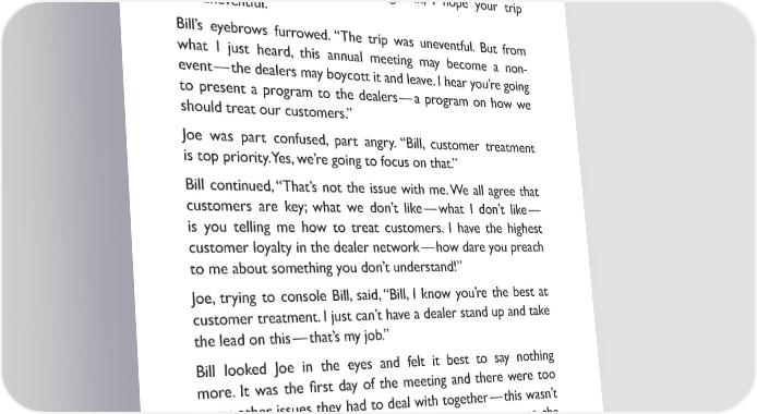 There was a knock on the door, and Joe peered through the opening — it was Bill, motioning to him. Great, Bill’s here, Joe sighed to himself. He’s the best dealer we have; it’ll be good to get out of this room for a few minutes. Joe left his executives and met with Bill next to the fountain in the hotel lobby. “Bill, glad you got in; I hope your trip was uneventful.” Bill’s eyebrows furrowed. “The trip was uneventful. But from what I just heard, this annual meeting may become a non- event — the dealers may boycott it and leave. I hear you’re going to present a program to the dealers — a program on how we should treat our customers.” Joe was part confused, part angry. “Bill, customer treatment is top priority. Yes, we’re going to focus on that.” Bill continued, “That’s not the issue with me. We all agree that customers are key; what we don’t like — what I don’t like — is you telling me how to treat customers. I have the highest customer loyalty in the dealer network — how dare you preach to me about something you don’t understand!” Joe, trying to console Bill, said, “Bill, I know you’re the best at customer treatment. I just can’t have a dealer stand up and take the lead on this — that’s my job.” Bill looked Joe in the eyes and felt it best to say nothing more. It was the 昀椀rst day of the meeting and there were too many other issues they had to deal with together — this wasn’t worth the 昀椀ght. Besides, tonight’s opening event was at the symphony — no reason to spoil it. Joe felt uneasy about the altercation with Bill but had to rush to get ready for the symphony performance. Joe’s Umbrellas had arranged for a special performance with a reception afterwards — the conductor was world renowned. Most of all, 7